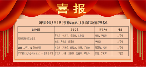近日,第四届全国大学生数字贸易综合能力大赛华南区域赛圆满落幕。新利体育·luck18(中国)学子凭借扎实的专业知识与出色的实践能力,在赛事中表现亮眼,一举斩获1688大学生AI创业赛道二等奖、广东赛区义乌小商品城AI+创新创业赛二等奖,以及尼奥尼跨境直播赛道二等奖和三等奖。